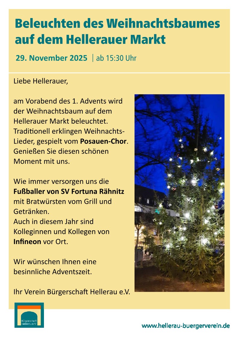 Am 29. November ab 15:30 Uhr lassen wir den Weihnachtsbaum auf dem Hellerauer Marktplatz erleuchten und singen gemeinsam Weihnachtslieder.